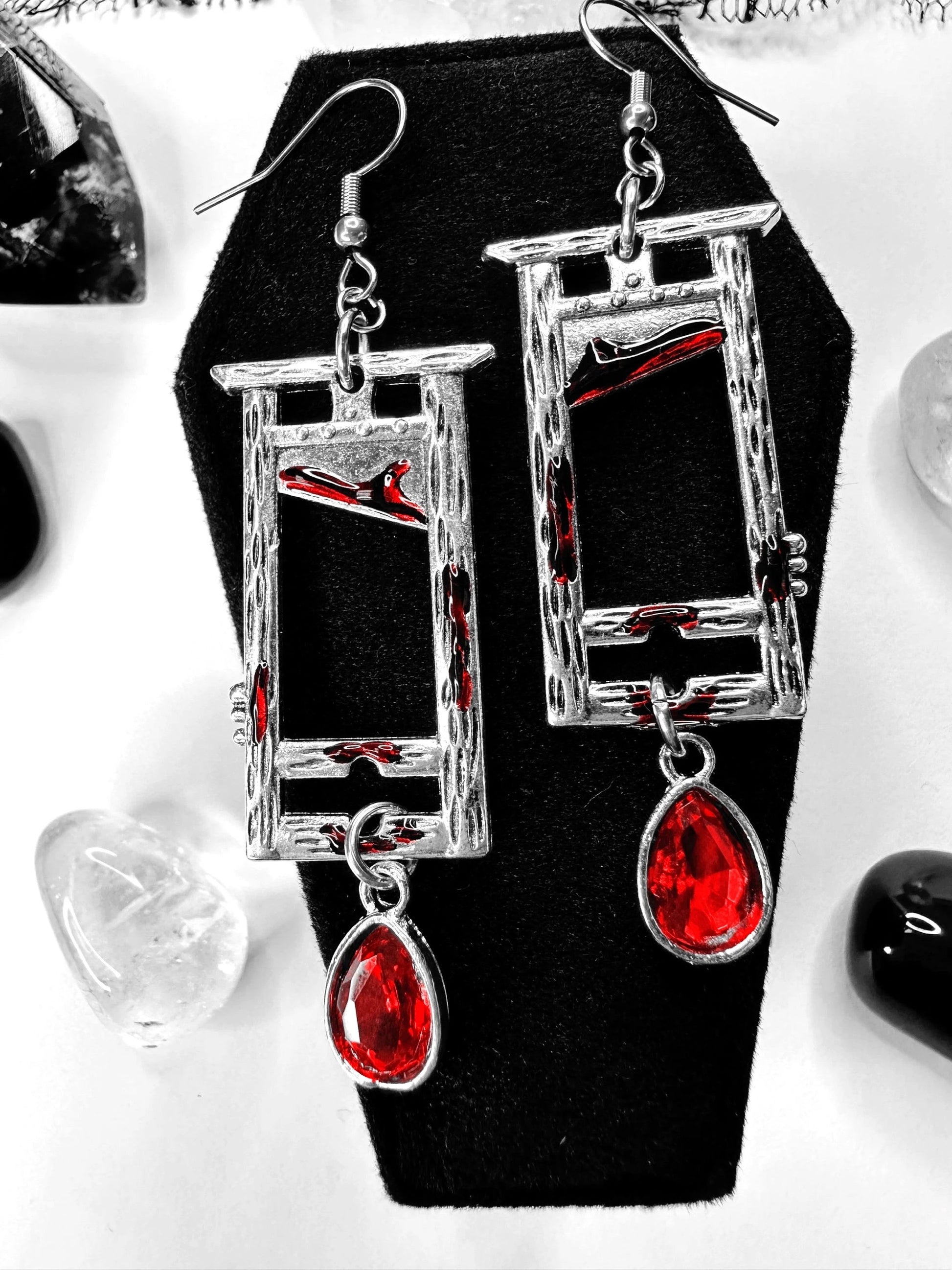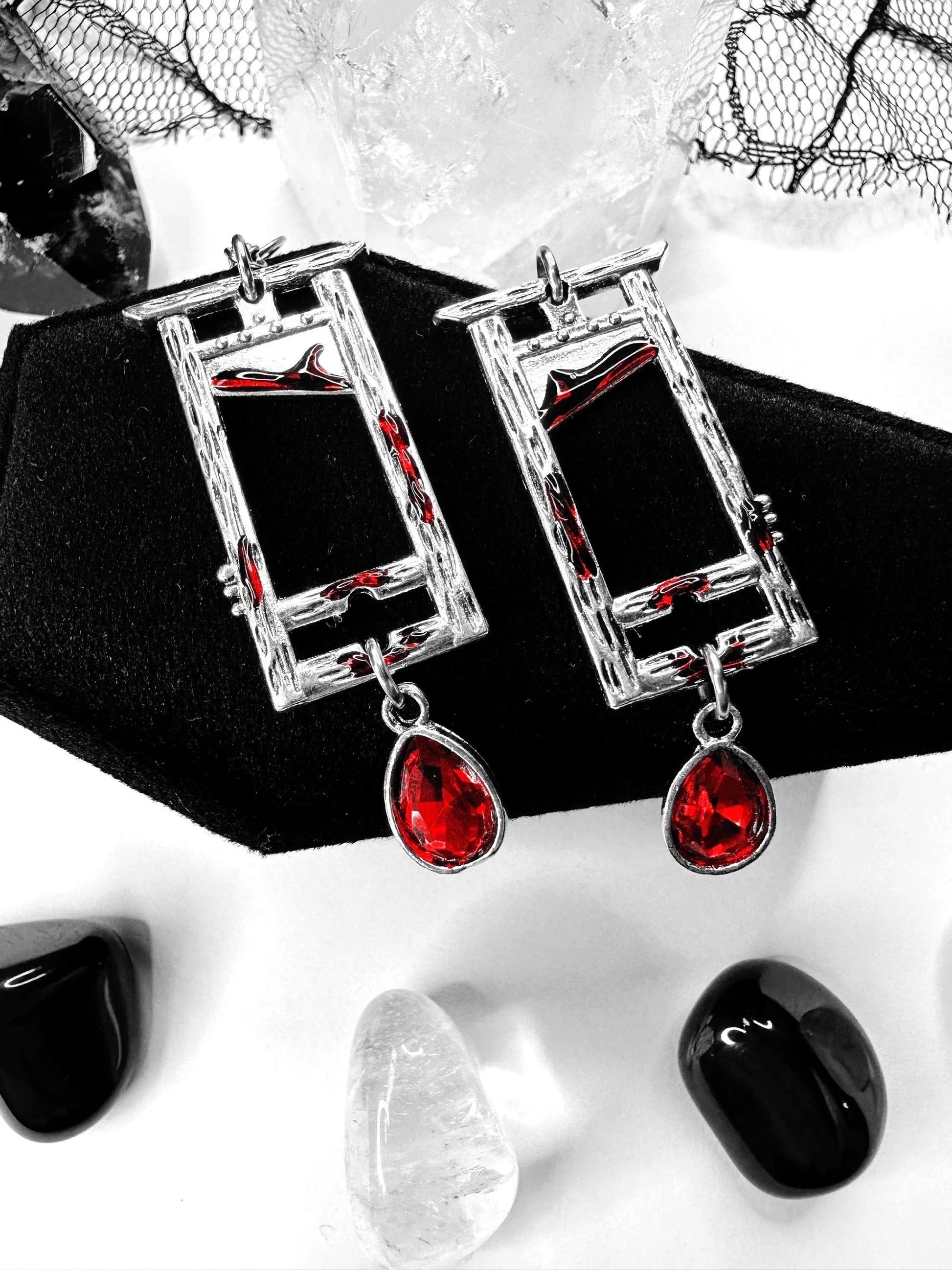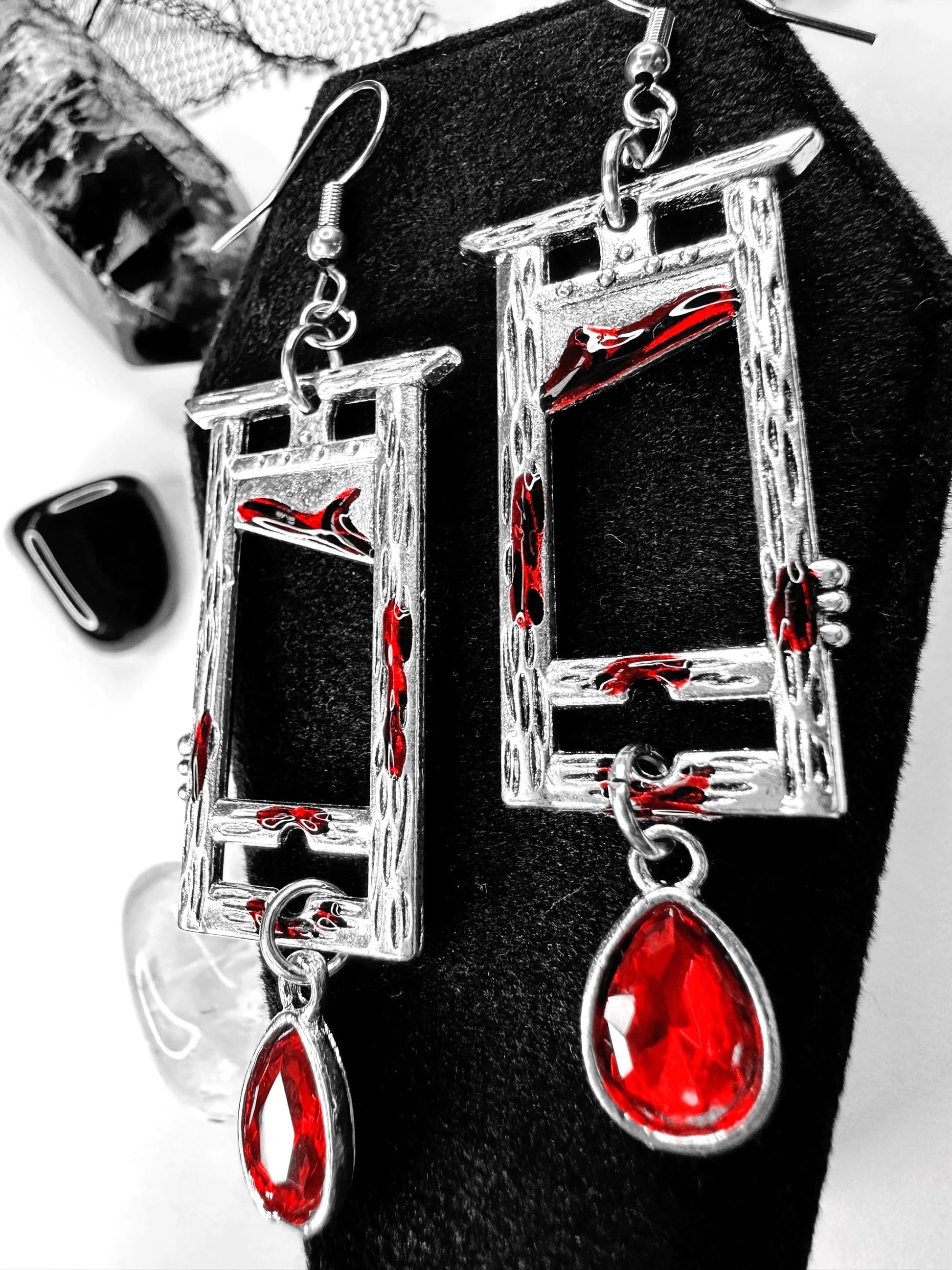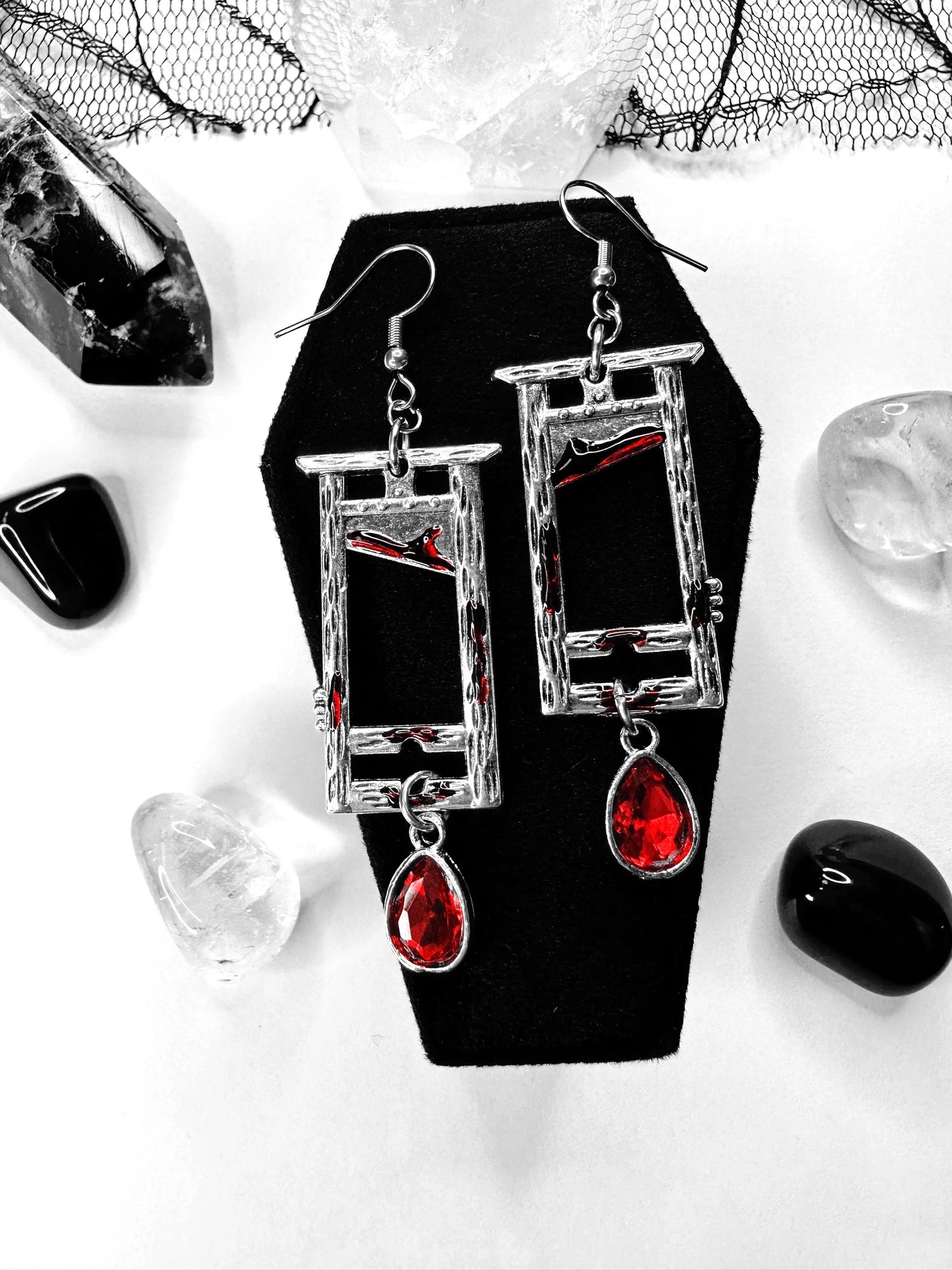 A Silver Coloured Guillotine With Blood Drips Suspends A Gorgeous Blood Droplet Gemstone
