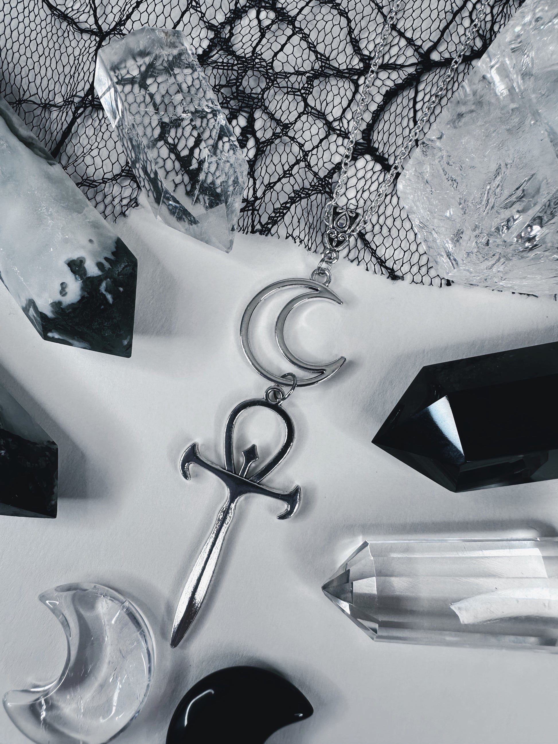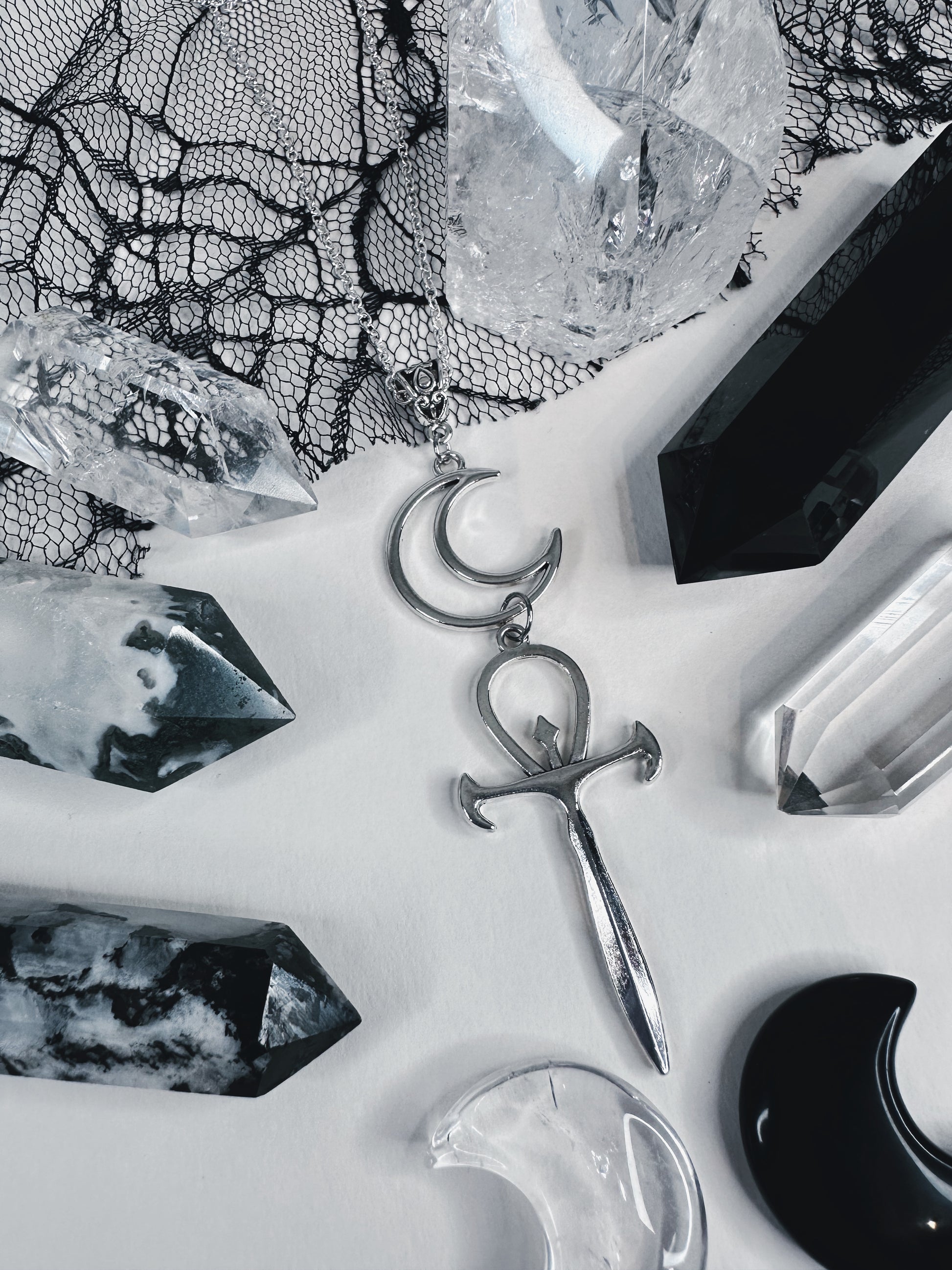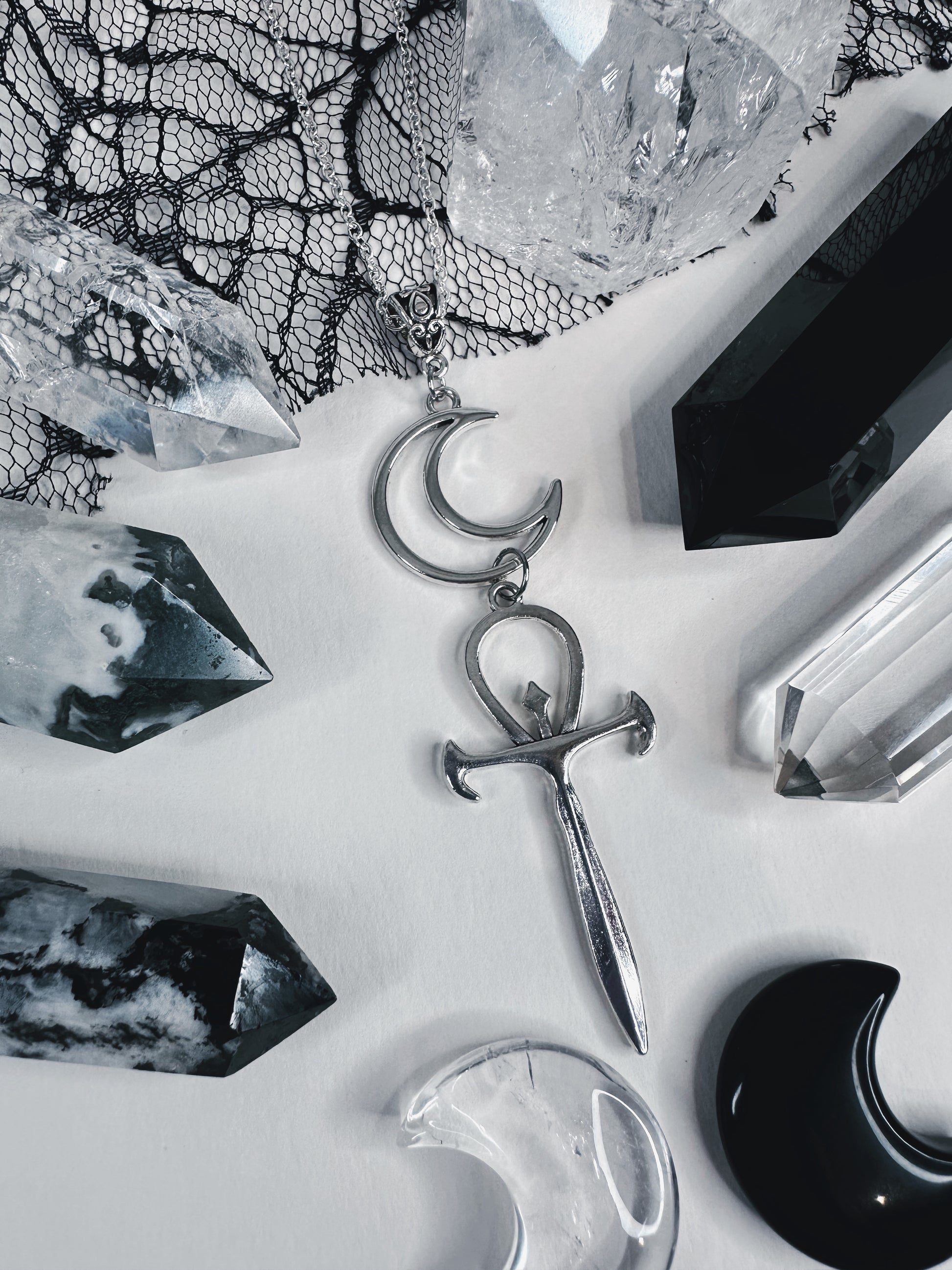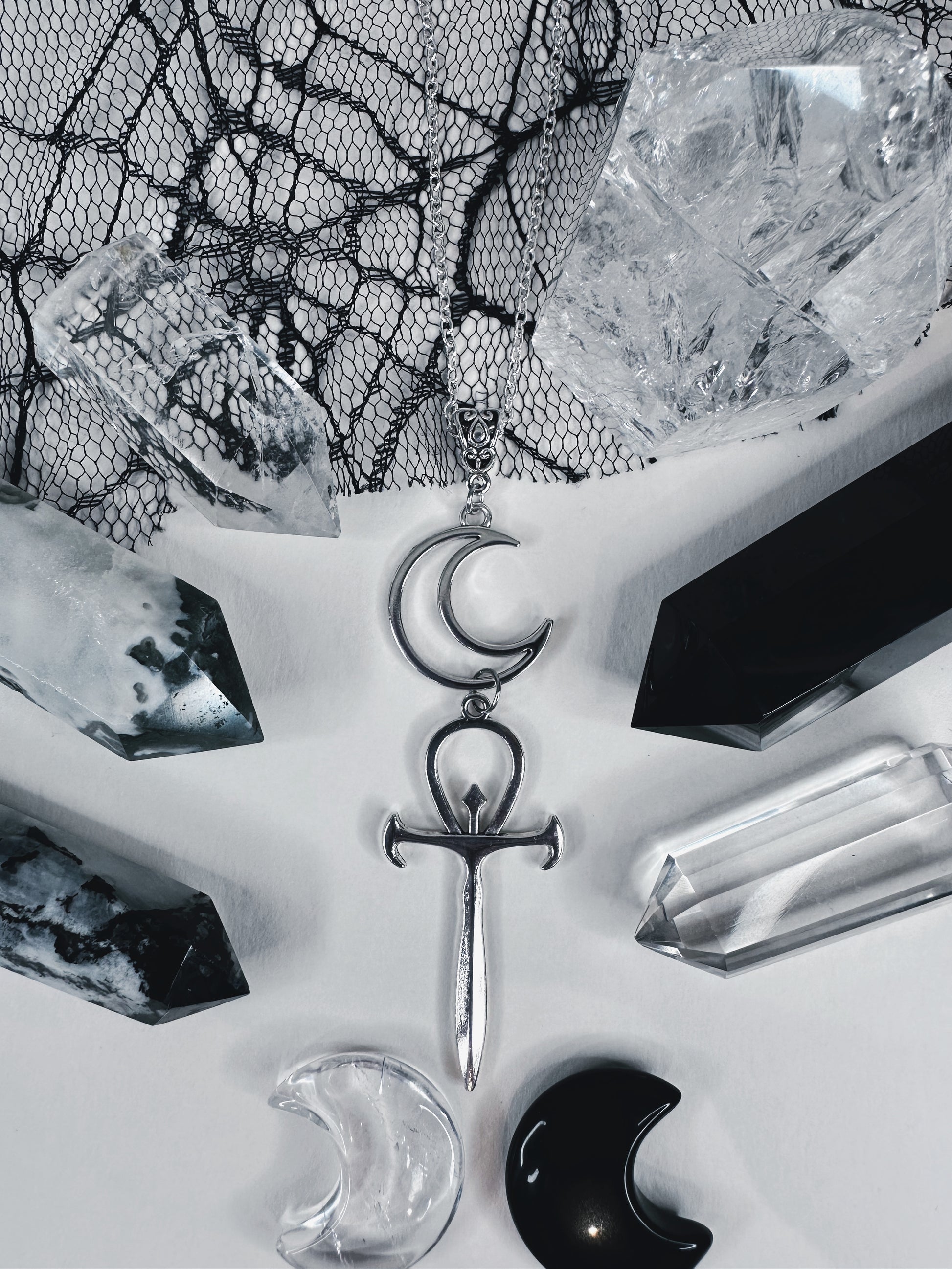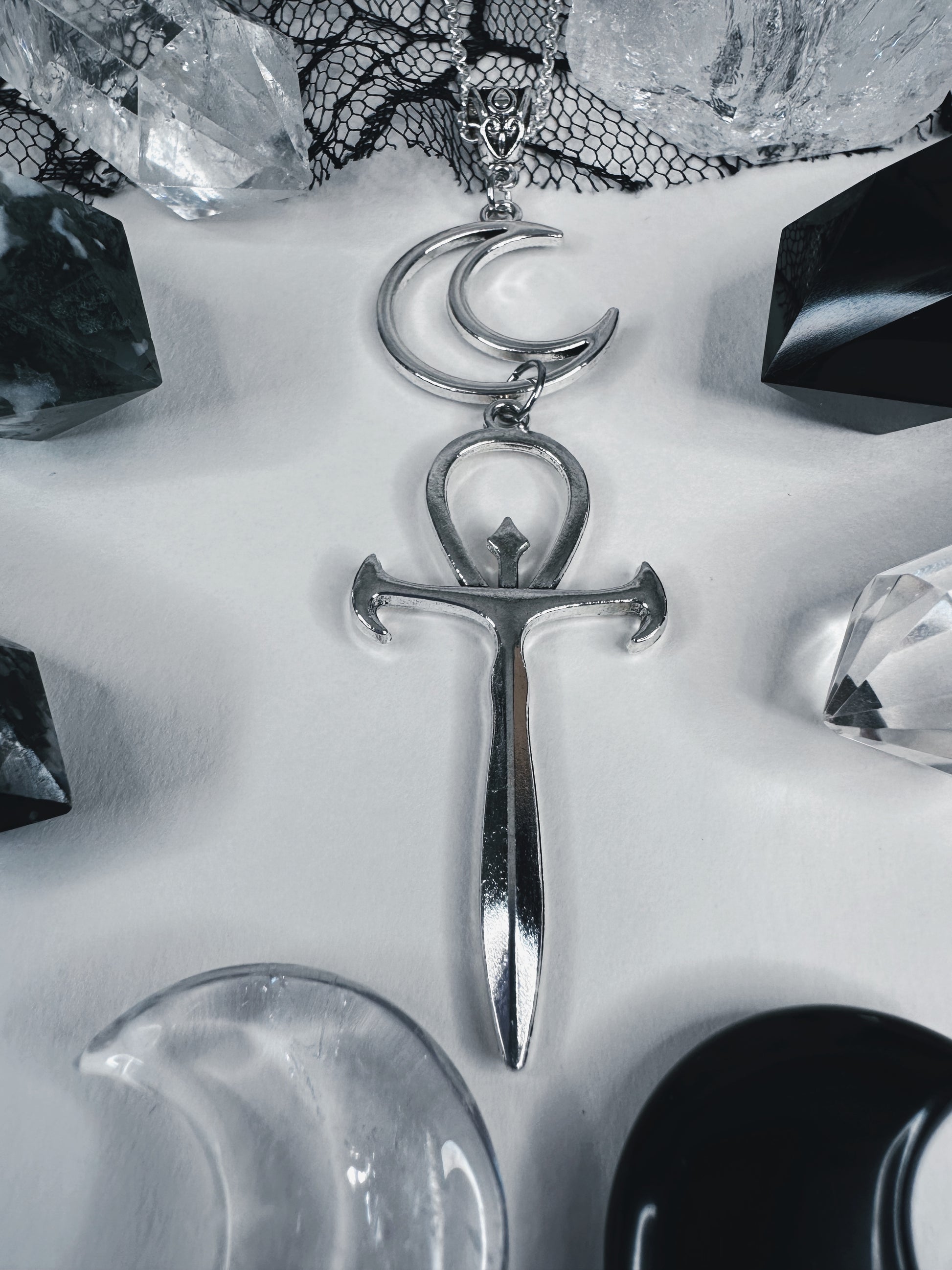 From A Silver Plated Chain Sits An Ornate Filigree Bail Suspending A Gorgeous Silver Crescent Moon Carrying A Stunning Ankh
