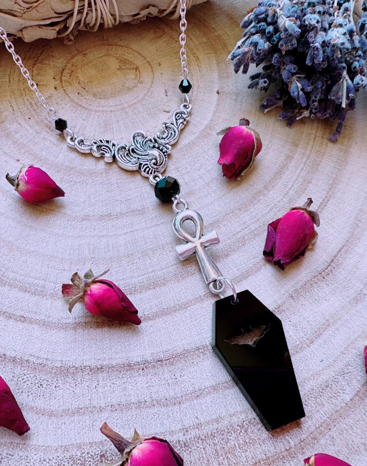 From A Silver Plated Chain Sits An Ornate Filigree Pendant, Suspending A Gorgeous Ankh & Black Coffin, Adorned With Black Austrian Crystal Beads