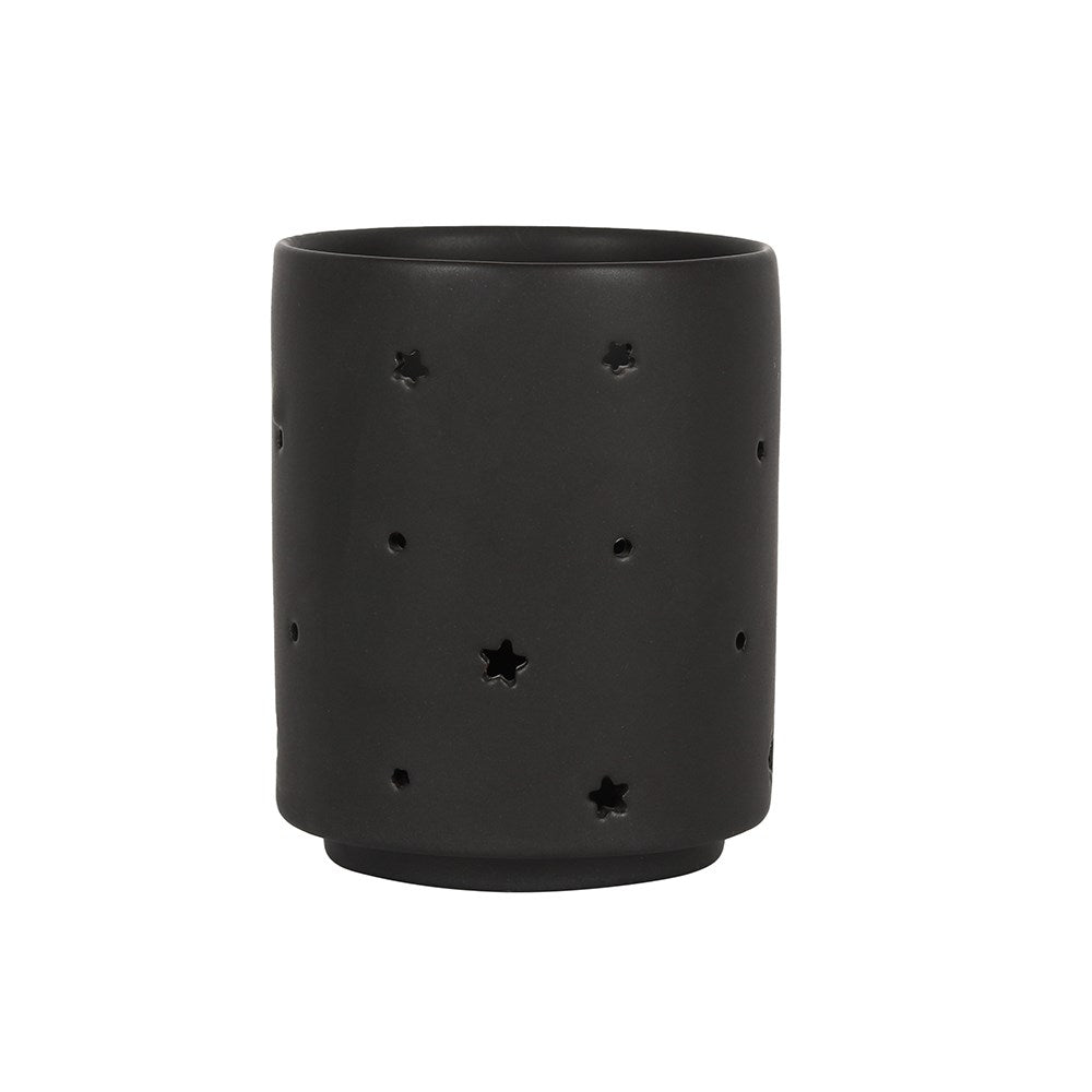 This ceramic tealight holder features a cutout crescent moon and star design in a cool, matte black finish