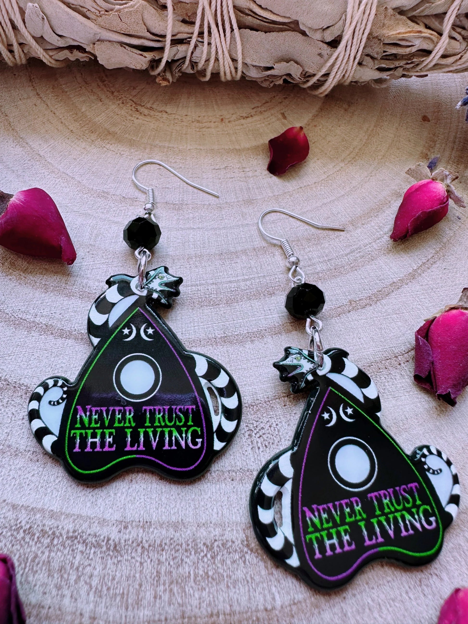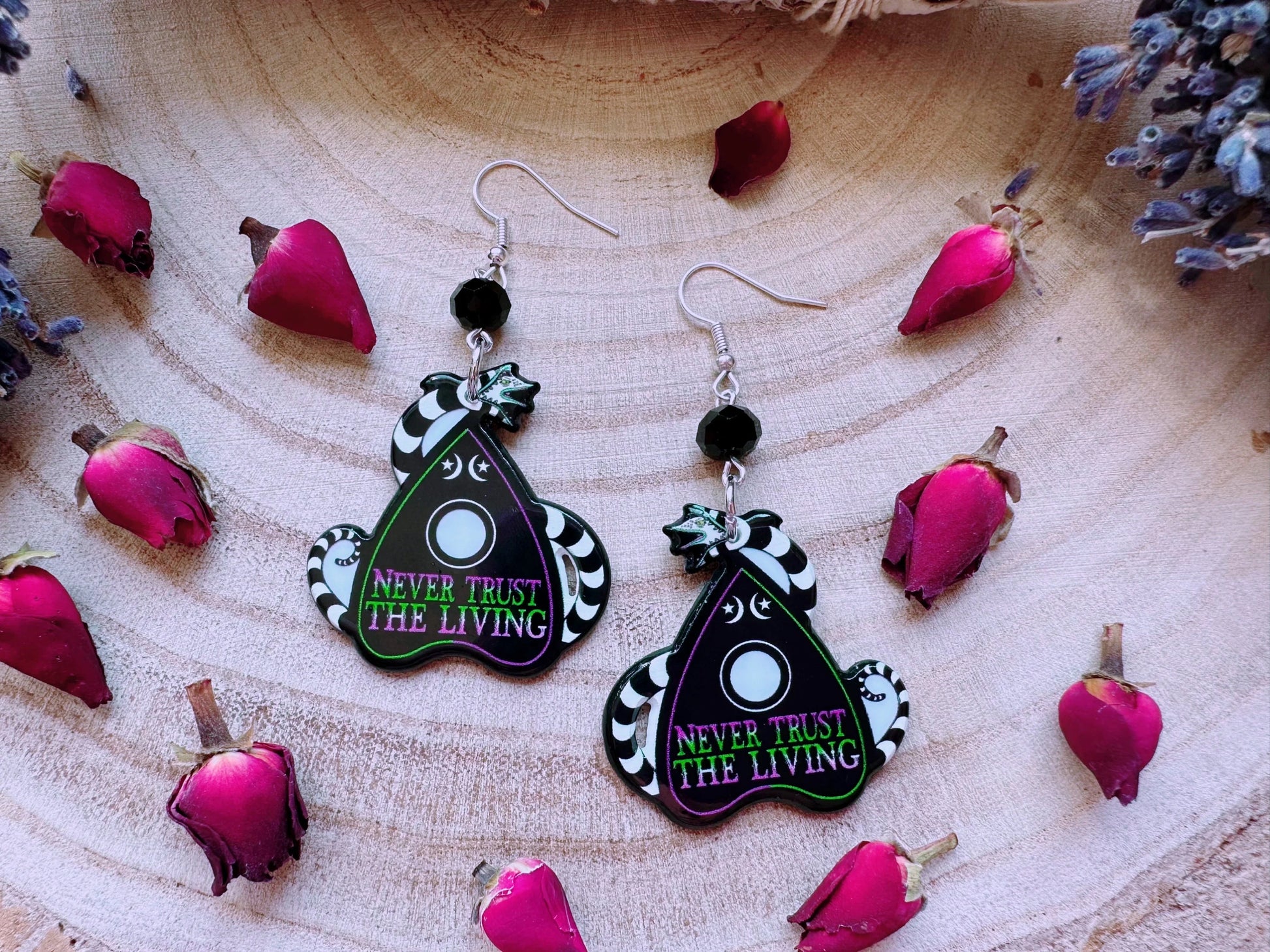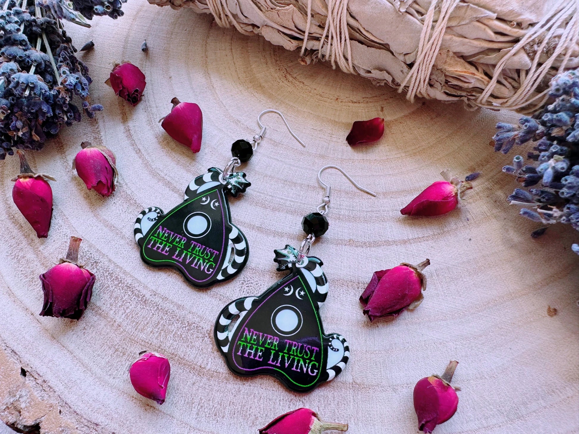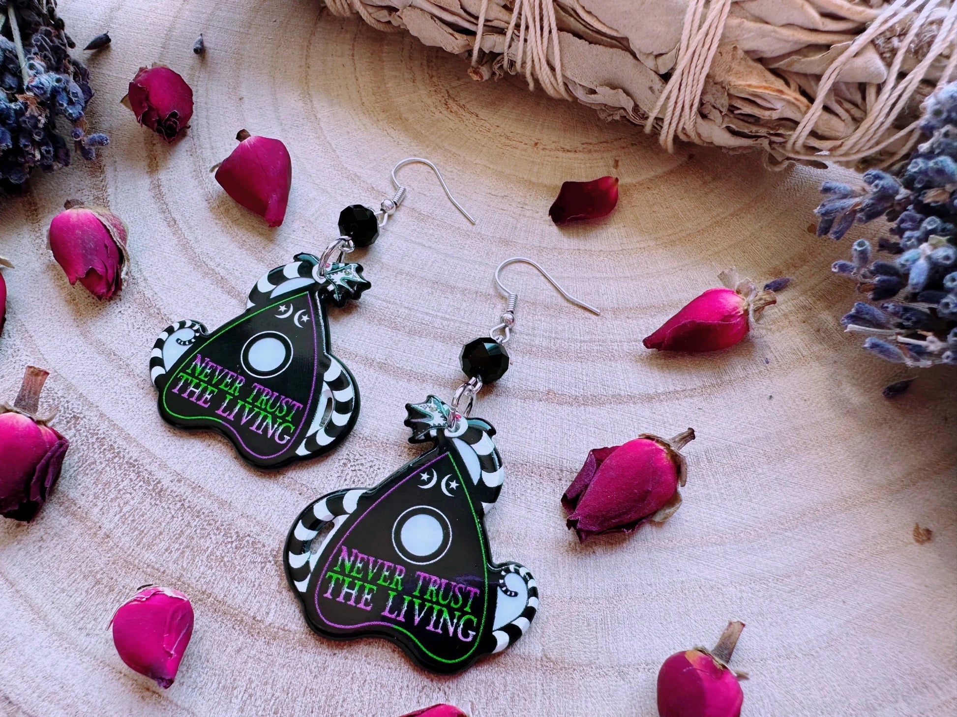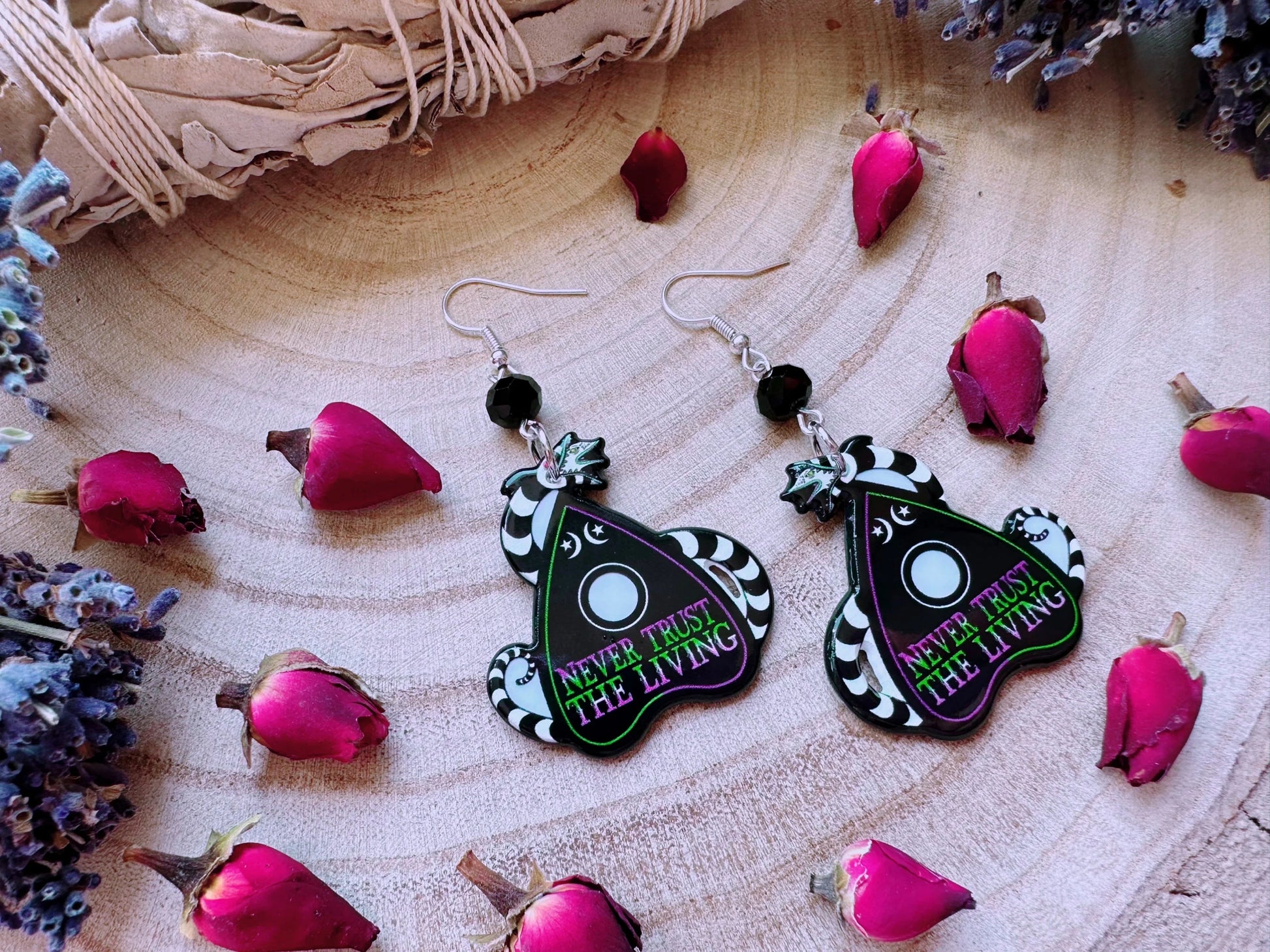 Suspended Are Gorgeous Ouija Planchette's With " Never Trust The Living " & Sandworms ! Adorned With Black Austrian Crystal Beads