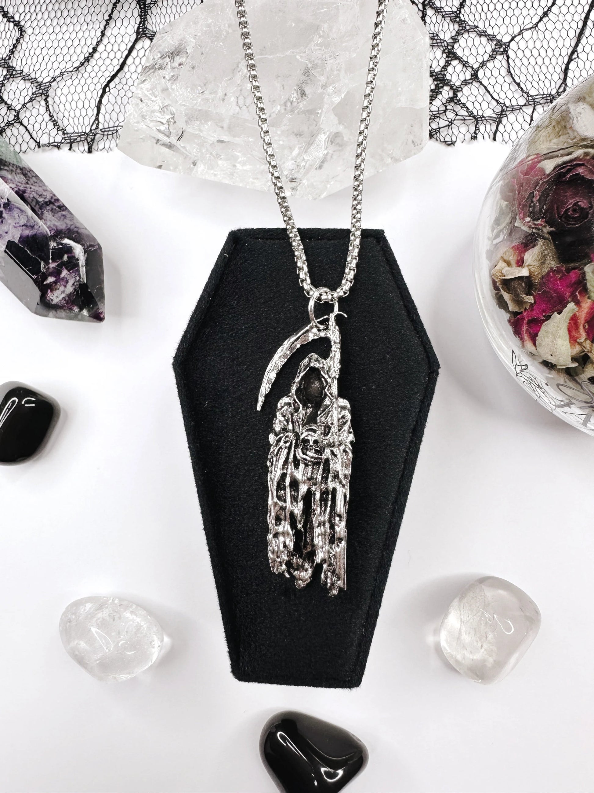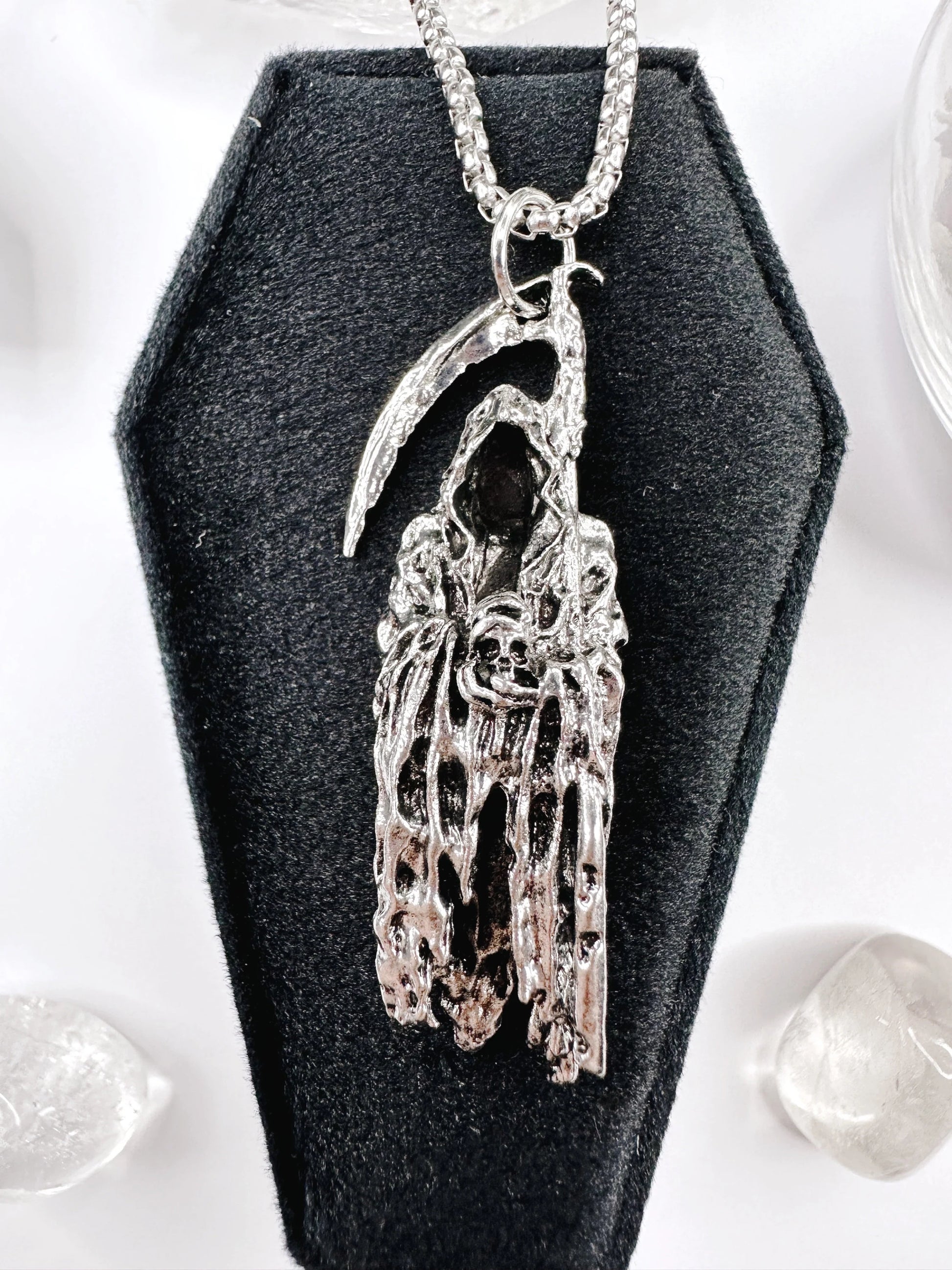 From A Stainless Steel Chain Suspending A Haunting Reaper Holding His Scythe & A Skull