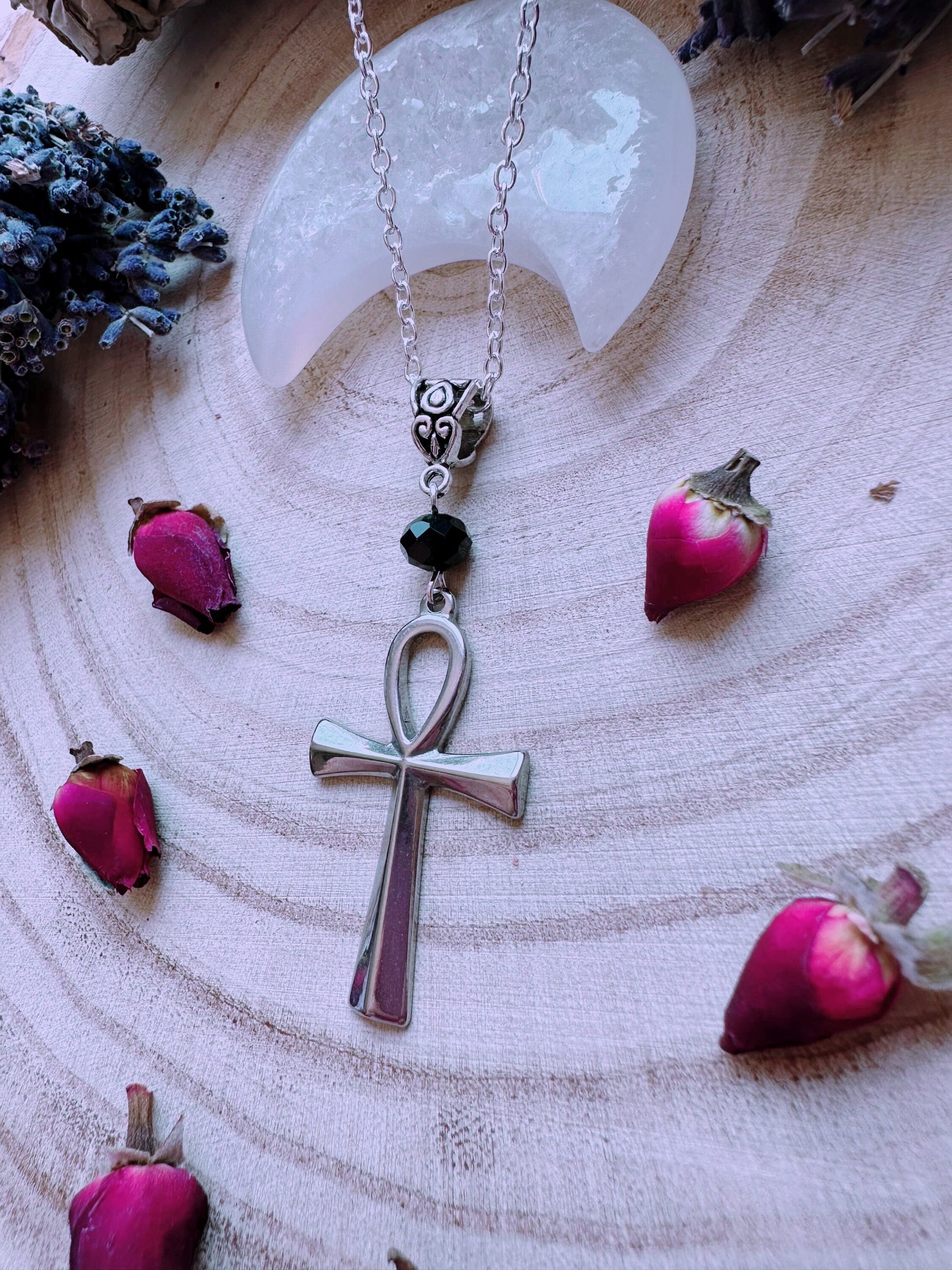 The Ankh Is Made From Stainless Steel & Is Lovingly Adorned With A Filigree Bail & A Black Austrian Crystal Bead On A Silver Plated Chain