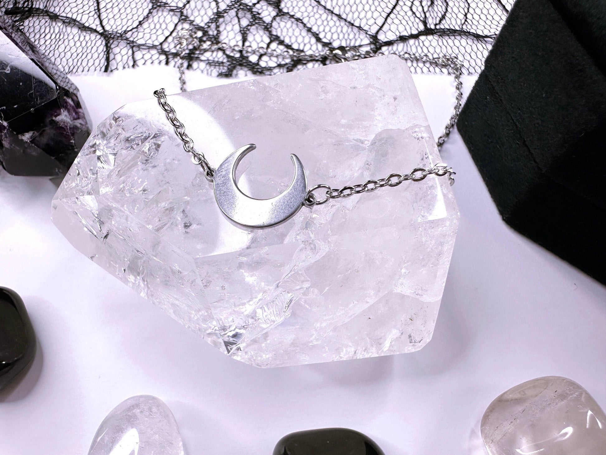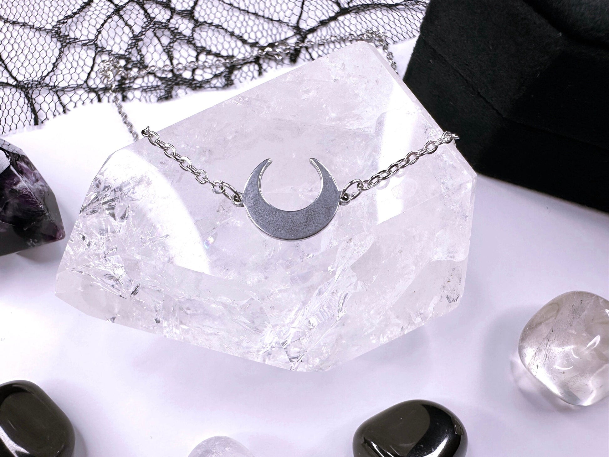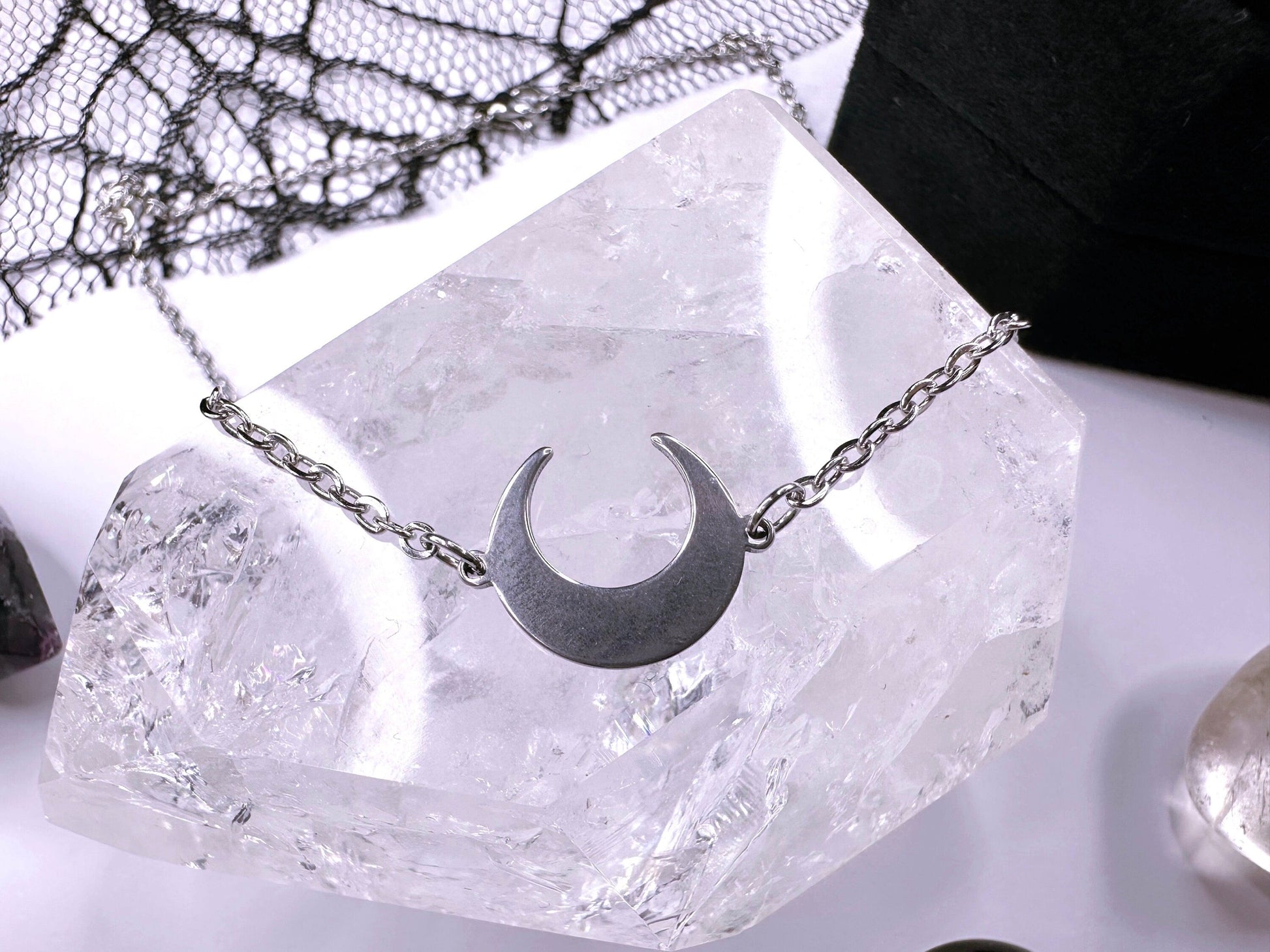 On A Stainless Steel Chain, Suspends An Absolutely Stunning Stainless Steel Crescent Moon