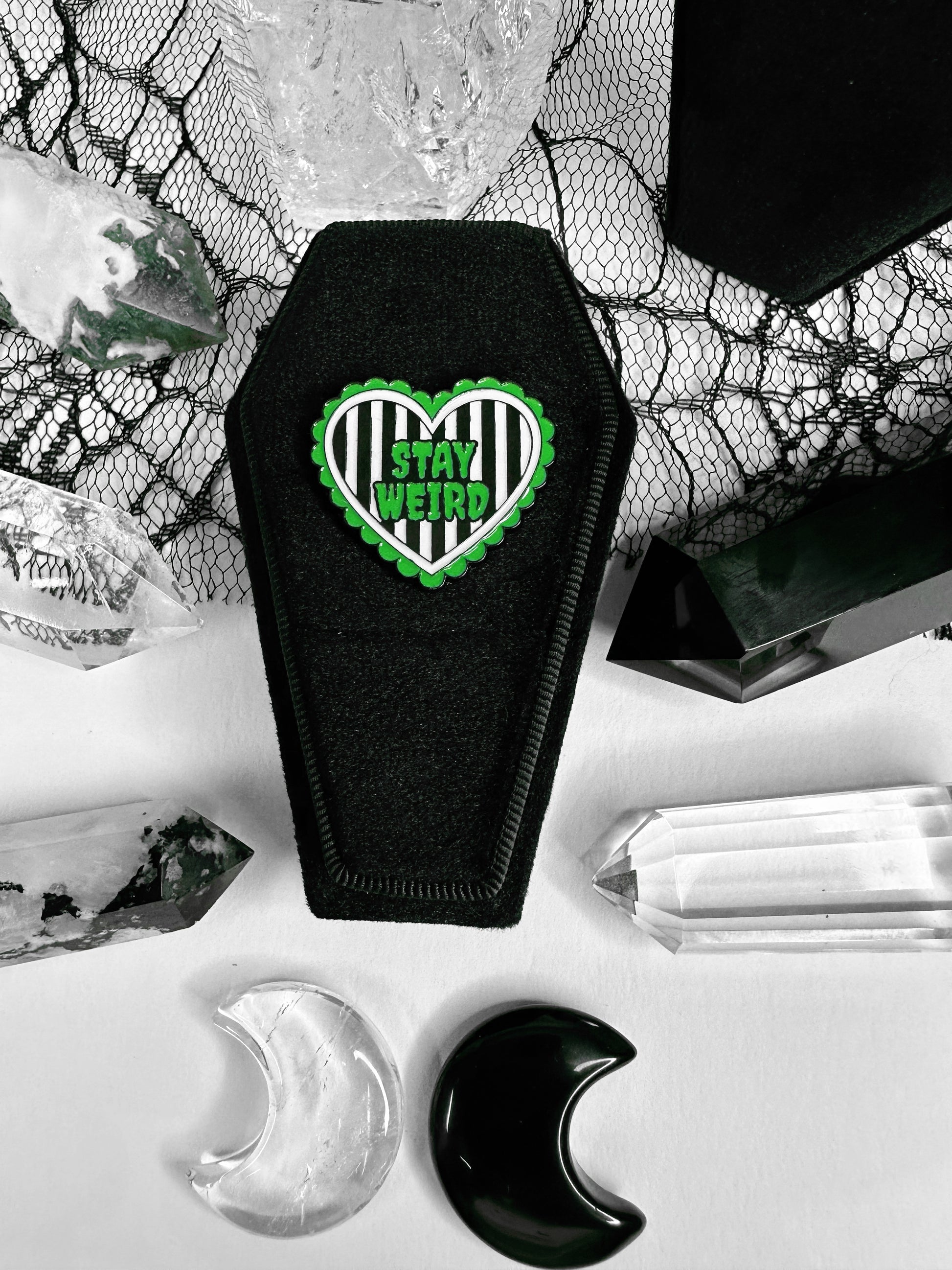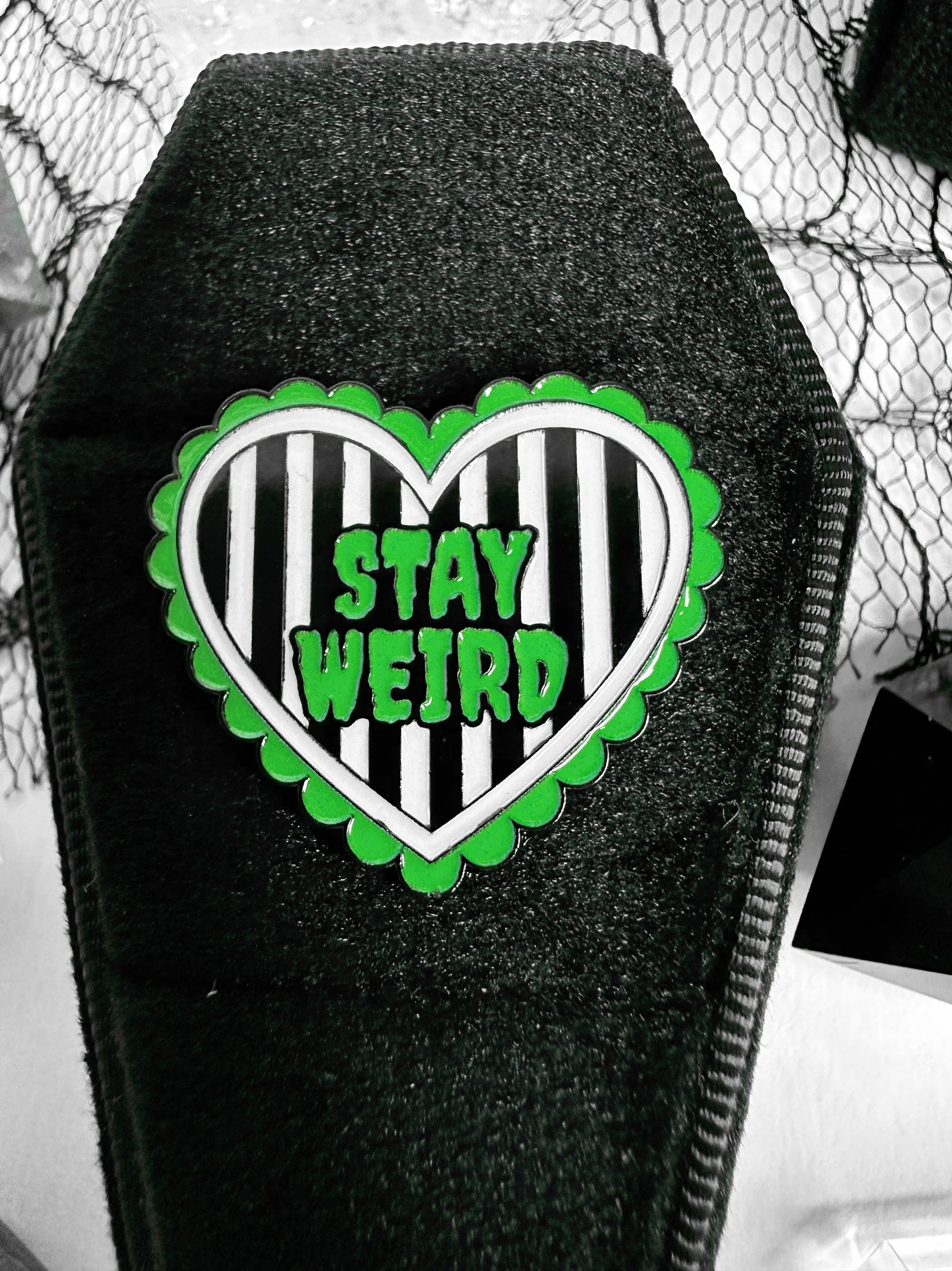Embrace your weirdness with our Stay Weird pin badge. Featuring Beetlejuice-inspired black and white stripes and a bold green horror gothic design, this quirky accessory is perfect for any alternative fashion lover. Stand out from the crowd and show off your unique style with this fun and playful pin. (Don't worry, we promise we won't judge - we're just as weird as you are!) Grab yours now and let your freak flag fly! 😉