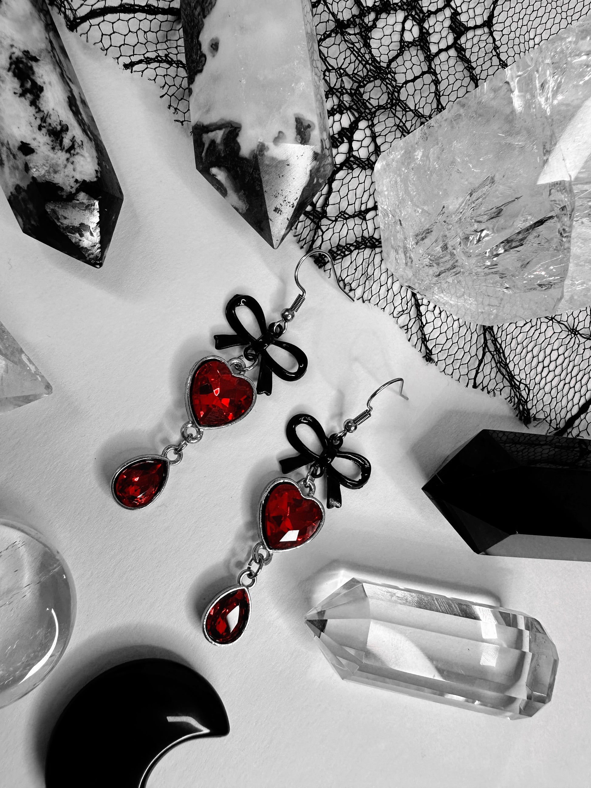 A Black Bow Suspends An Absolutely Stunning Blood Red Glass Heart & Teardrop In The Same Beautiful Colour