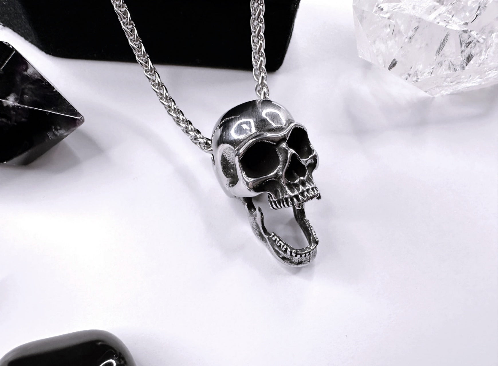 From A Stainless Steel Chain, Suspending A Gorgeous 3D Stainless Steel Skull Pendant With Fangs & Open Jaw