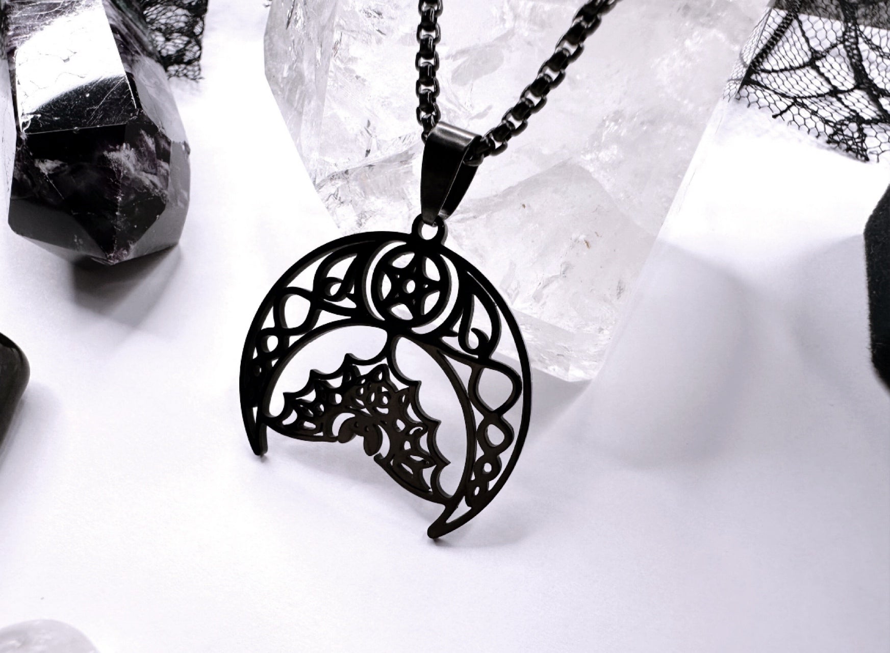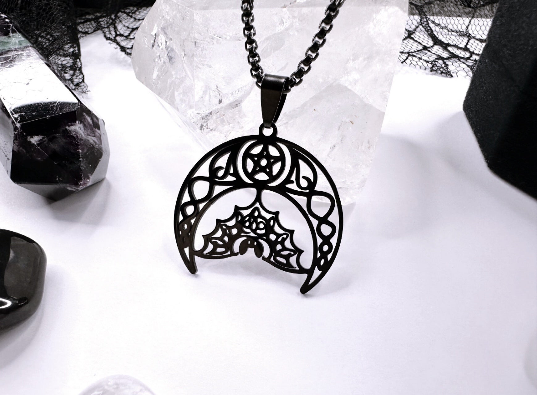 From A Black Stainless Steel Chain Sits An Ornate Filigree Crescent Moon With A Pentagram, Suspending A Gorgeous Black Bat, All Made From Stainless Steel