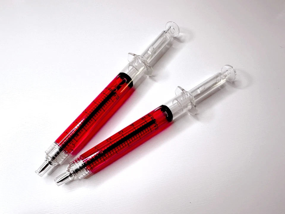 The bloody syringe as a ballpoint pen, which looks as if you have just drawn blood from someone, makes you a credible hobby doctor.