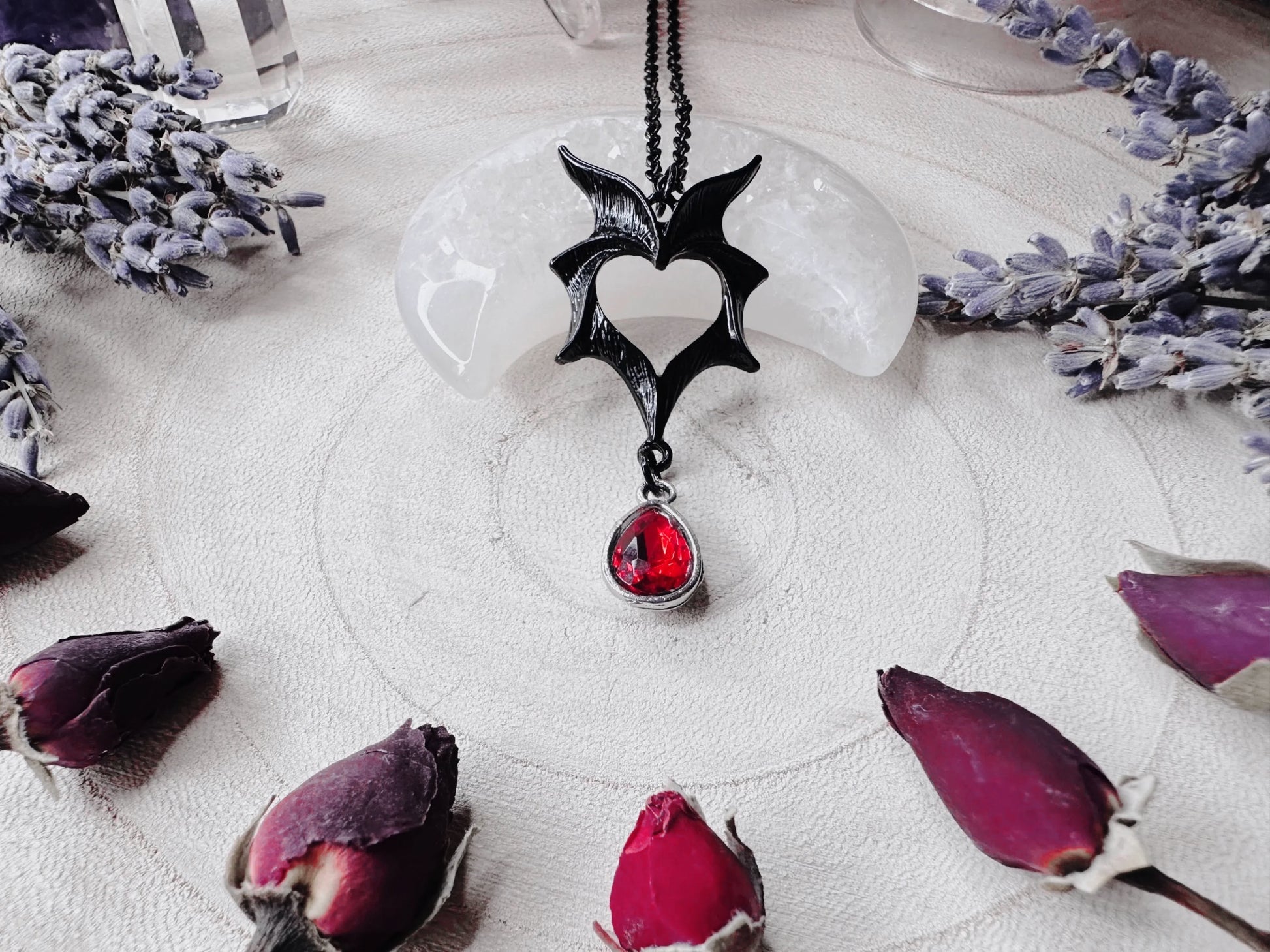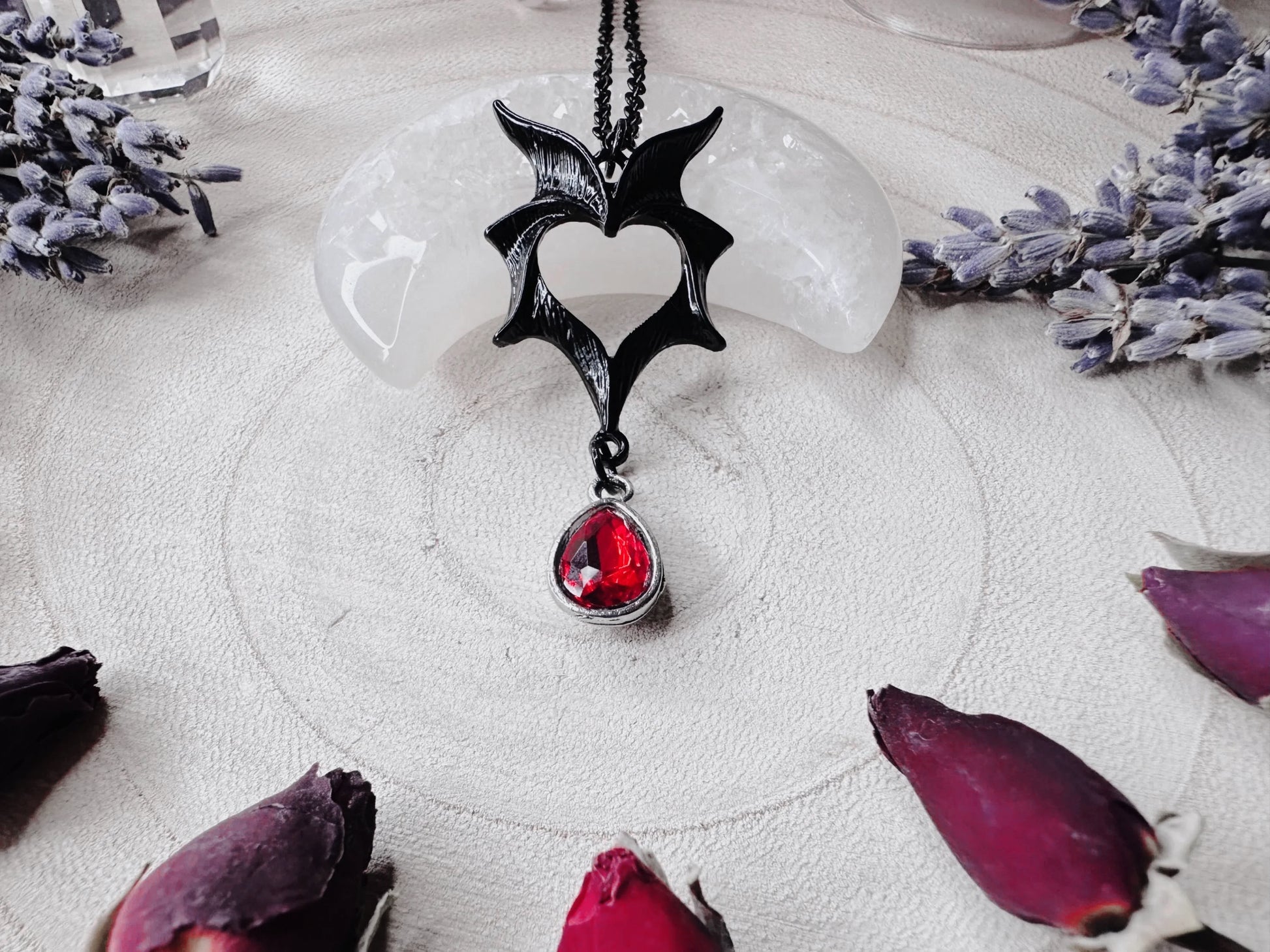 The Gorgeous Bat Wing Centerpiece Measures 3.5cm In length & 2cm In Width, Adorned With A Gorgeous Blood Red Gemstone Which Measures 1.5cm In Length & 1cm In Width Suspended On A 50cm Black Stainless Steel Chain