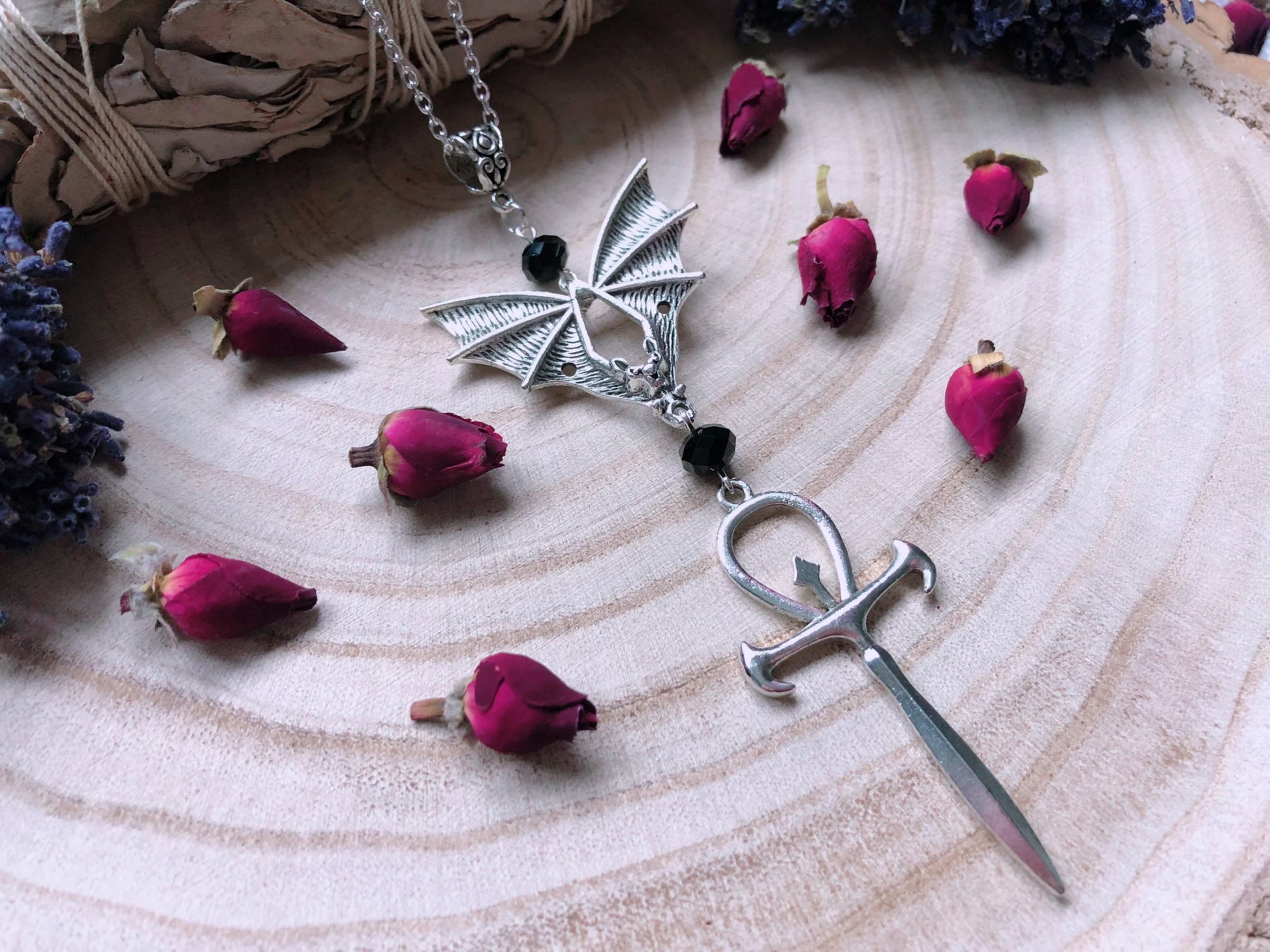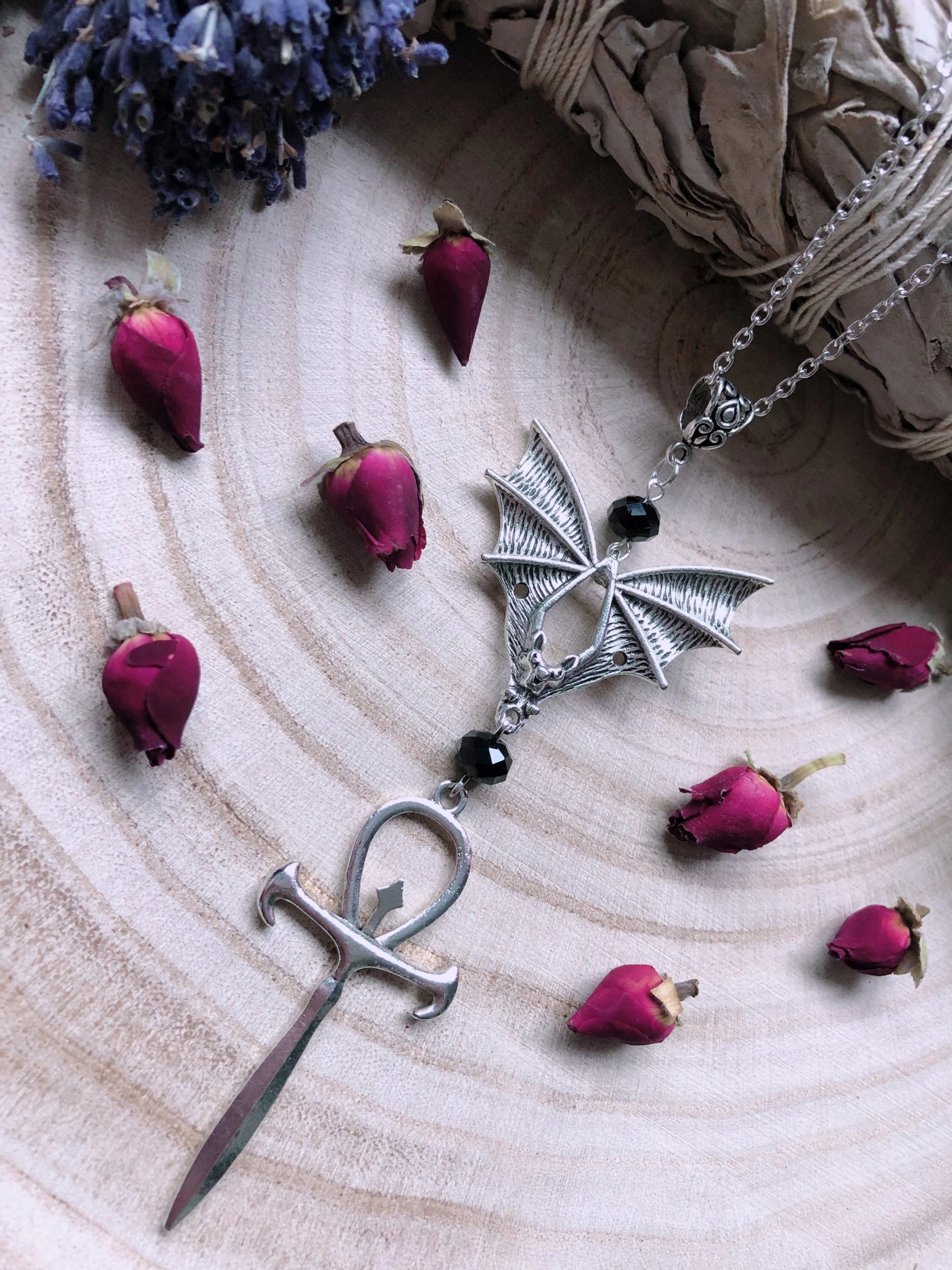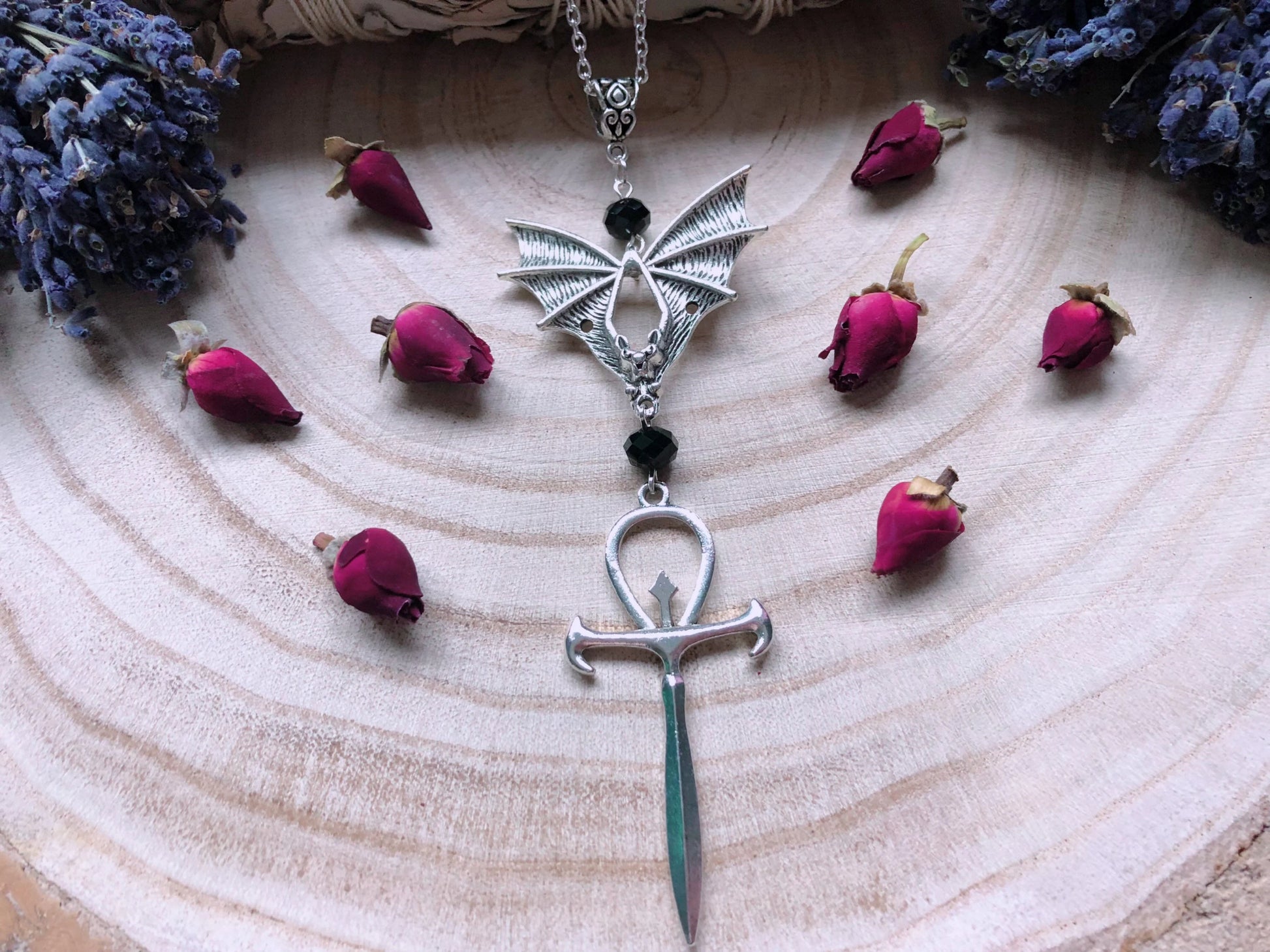 From A Silver Plated Chain Sits An Ornate Filigree Pendant, Suspending A Gorgeous Vampyr Bat Carrying A Stunning Ankh Adorned With Black Austrian Crystal Beads